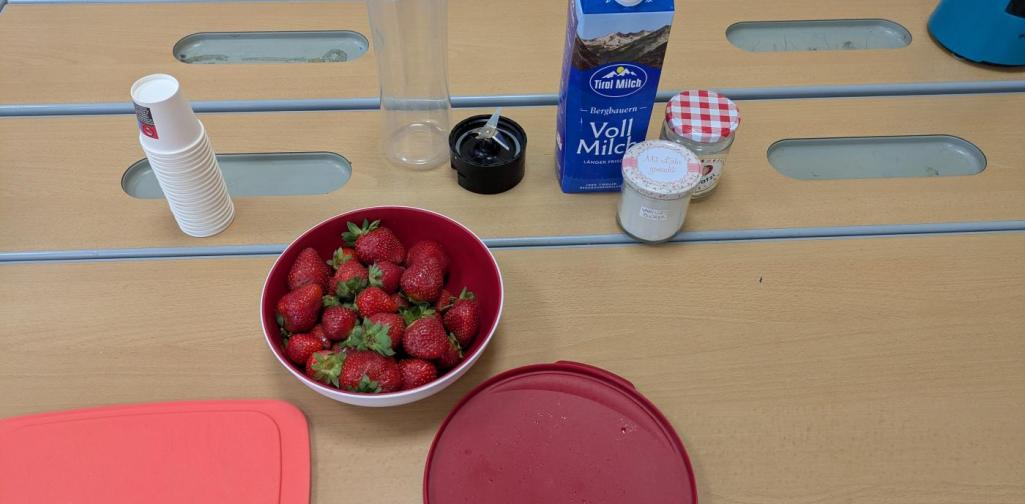 Besonderes Highlight war die Herstellung von frischer Erdbeermilch – natürlich mit regionalen Zutaten! Die Kinder durften selbst Hand anlegen, Erdbeeren pürieren und mit Milch vermengen. Dabei wurde nicht nur der Geschmackssinn geschult, sondern auch das Bewusstsein für gesunde Ernährung und regionale Produkte gestärkt.
