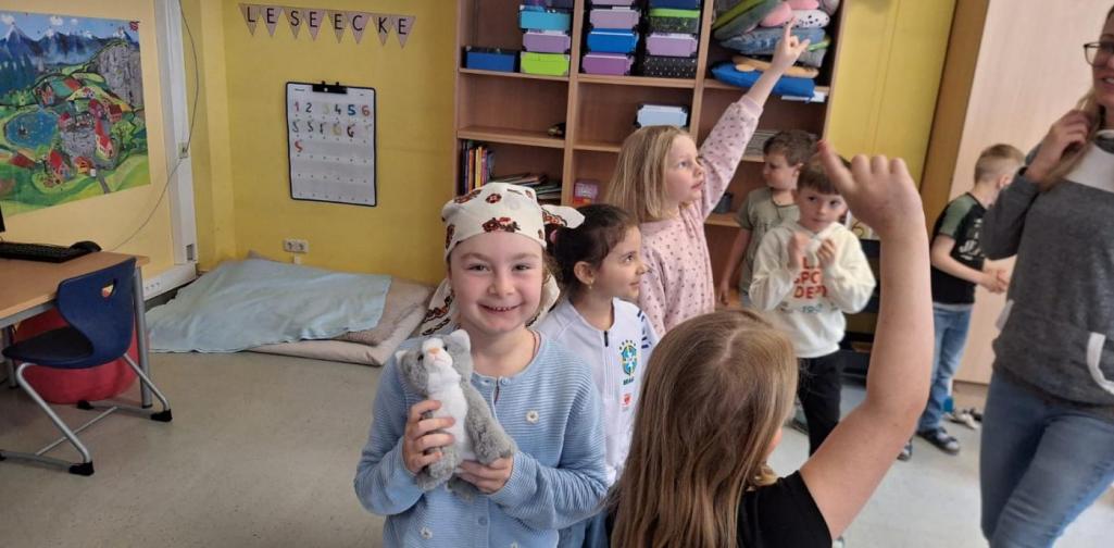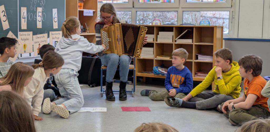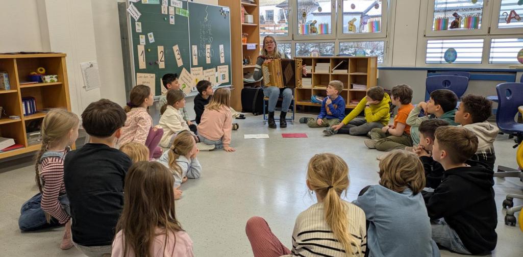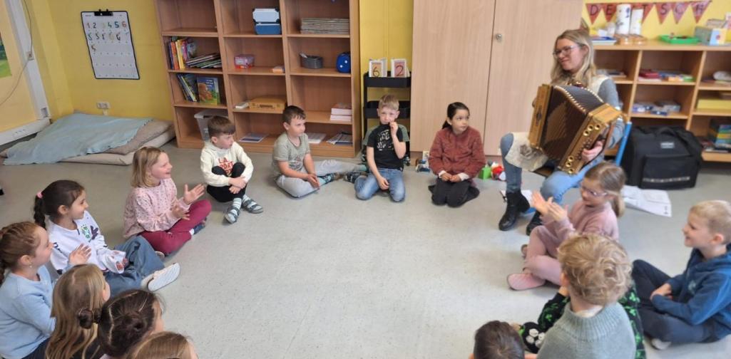 Unter diesem fröhlichen Motto durften wir eine ganz besondere musikalische Stunde erleben. Gemeinsam mit Caroline Kostner lernten die Kinder viele Tiroler Lieder kennen und sangen mit großer Begeisterung mit. Begleitet wurde das Singen von der Ziehharmonika, deren schwungvolle Klänge sofort für gute Stimmung sorgten.