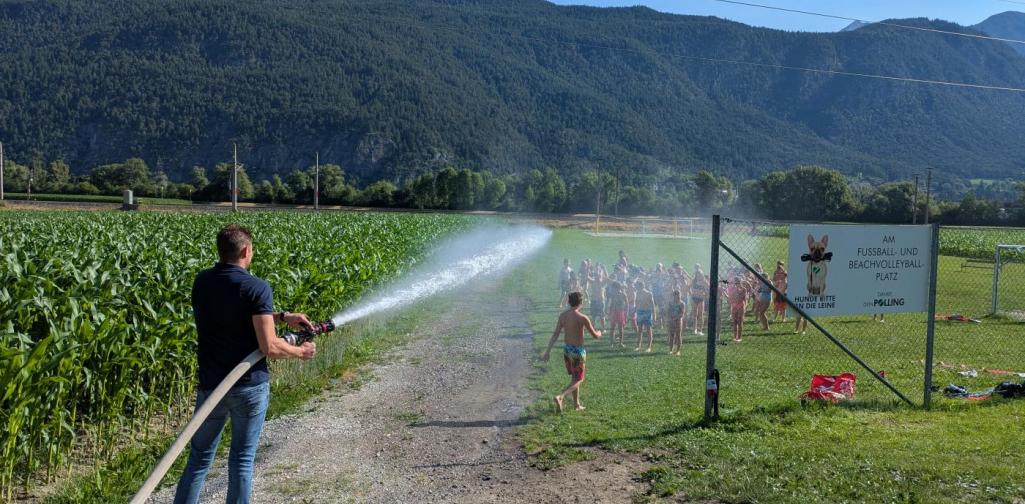 Ein ganz besonderes Highlight wartete zum Abschluss auf alle: Daum Marco von der Feuerwehr kam mit dem großen Tanklöschfahrzeug vorbei und sorgte für eine erfrischende Abkühlung mit dem Wasserschlauch – ein Riesenspaß bei sommerlichen Temperaturen!